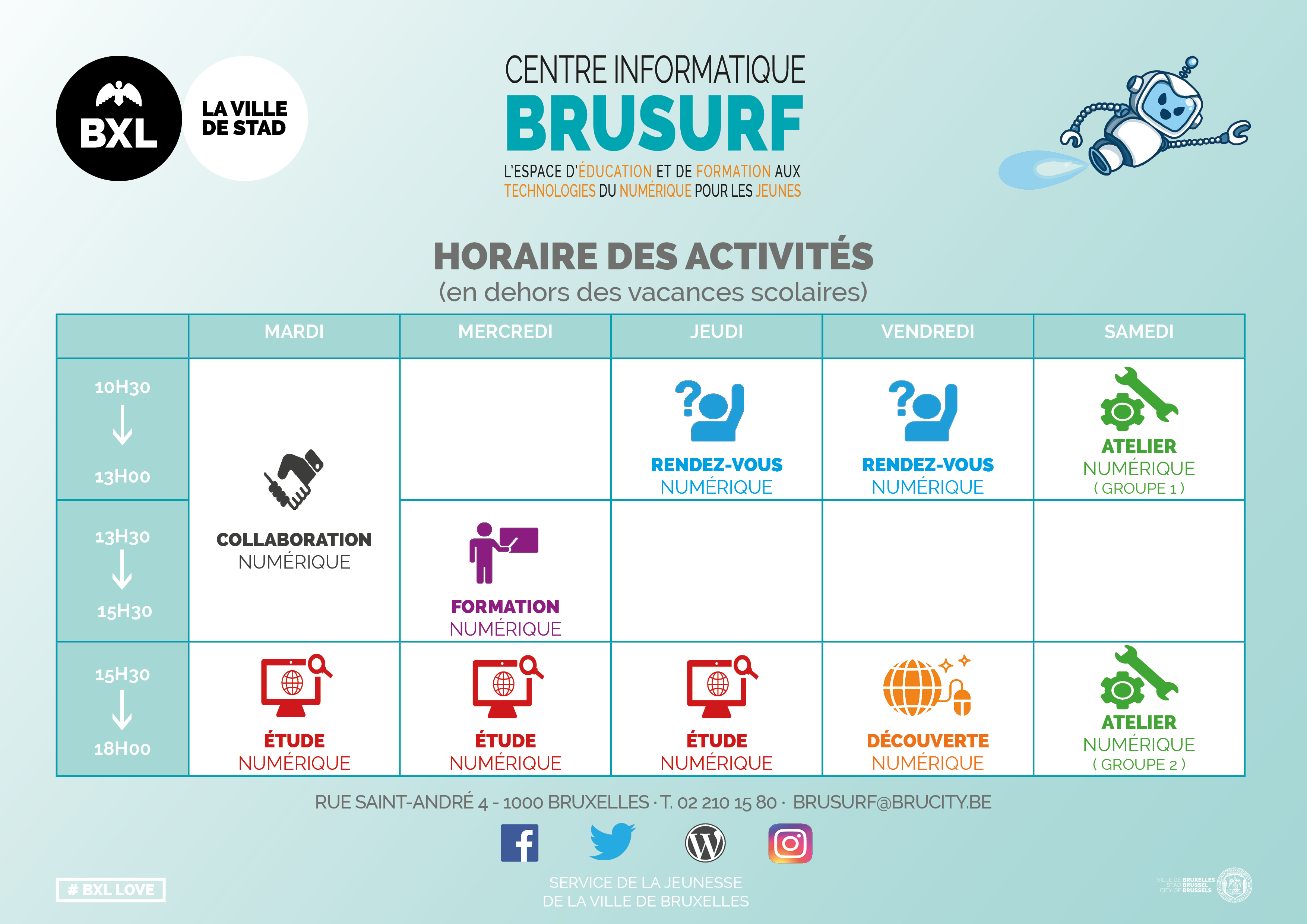 Un parc informatique composé de 10 PC, deux imprimantes, une imprimante 3D, un scanner, une photocopieuse, des tablettes, des robots, … sont à disposition du jeune public dans le cadre de stages, de formations ou d’ateliers divers, en après-midi , les samedis ou pendant les vacances scolaires. De nombreuses collaborations avec des associations viennent enrichir la programmation.